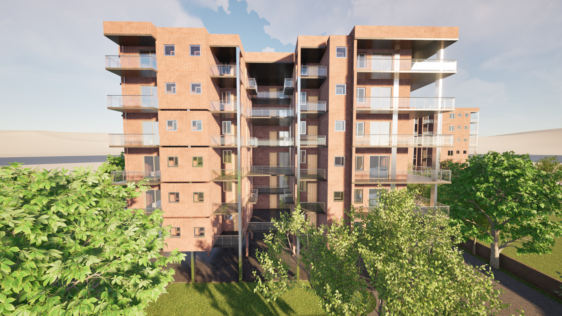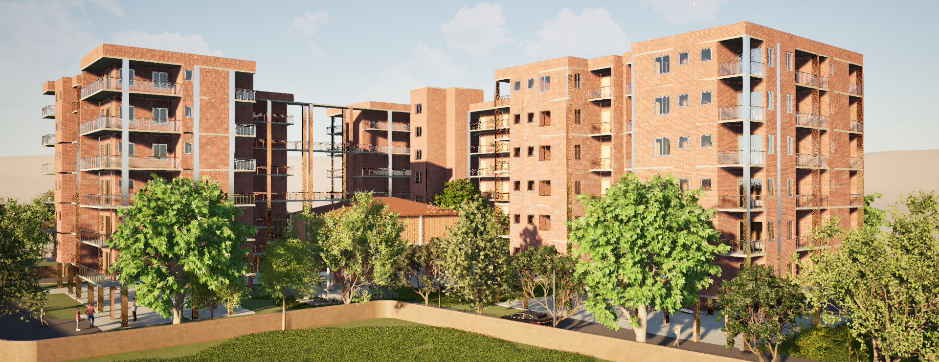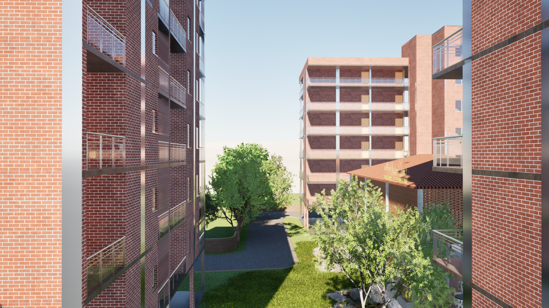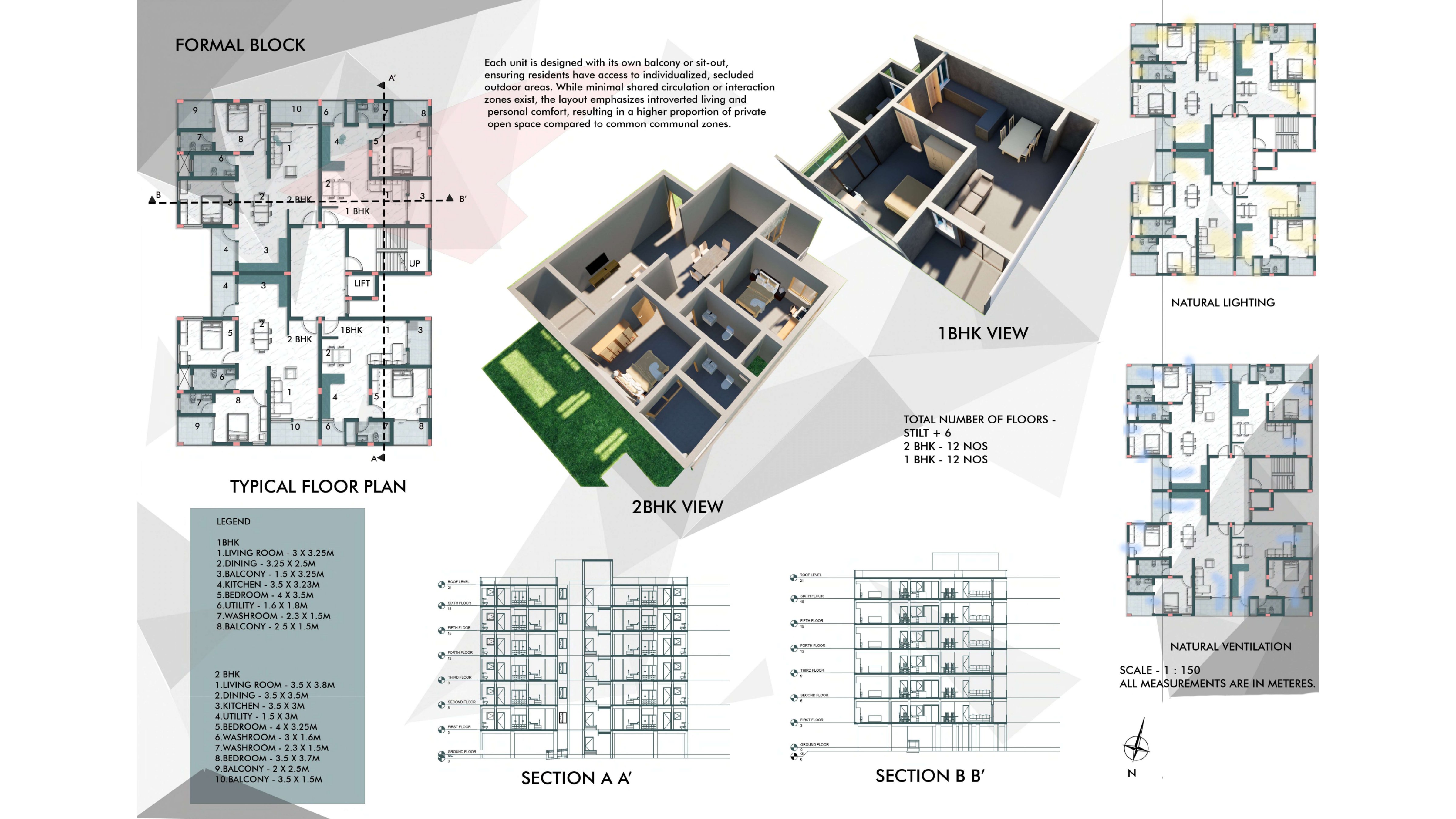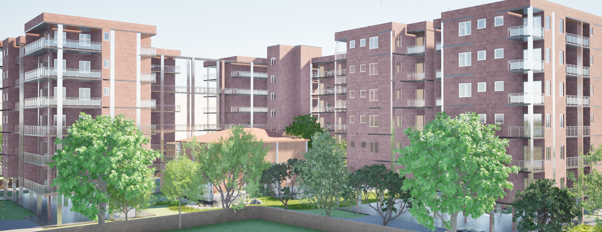 A high-density residential complex focusing on natural light optimization and green communal spaces. The design incorporates passive solar strategies and maximizes outdoor living areas.